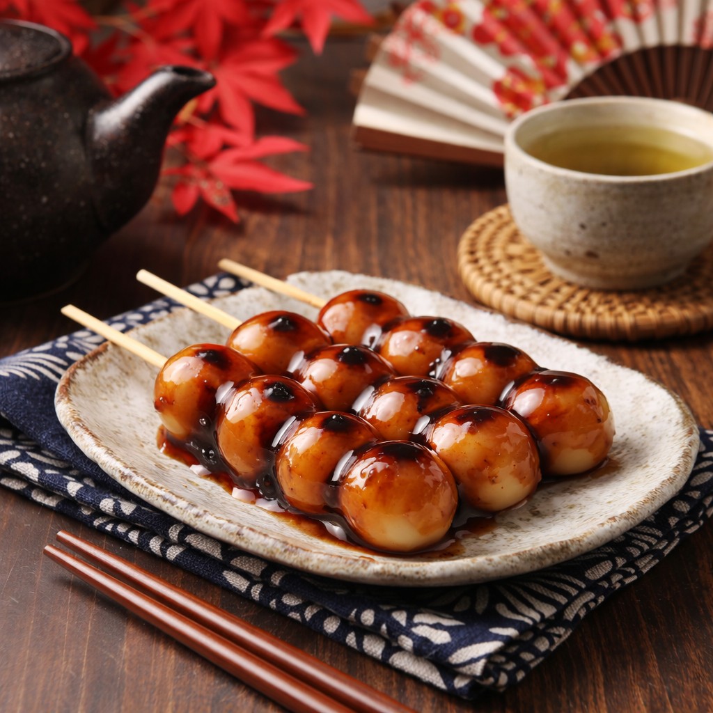 Mitarashi Dango sind traditionelle japanische Reiskugeln aus Reismehl. Die runden Bällchen werden auf Holzspieße gesteckt und mit einer süßlich-würzigen Glasur auf Basis von Sojasoße überzogen. Die Kombination aus milder Süße und salziger Note ist typisch für diese Form der Wagashi (japanische Süßwaren).