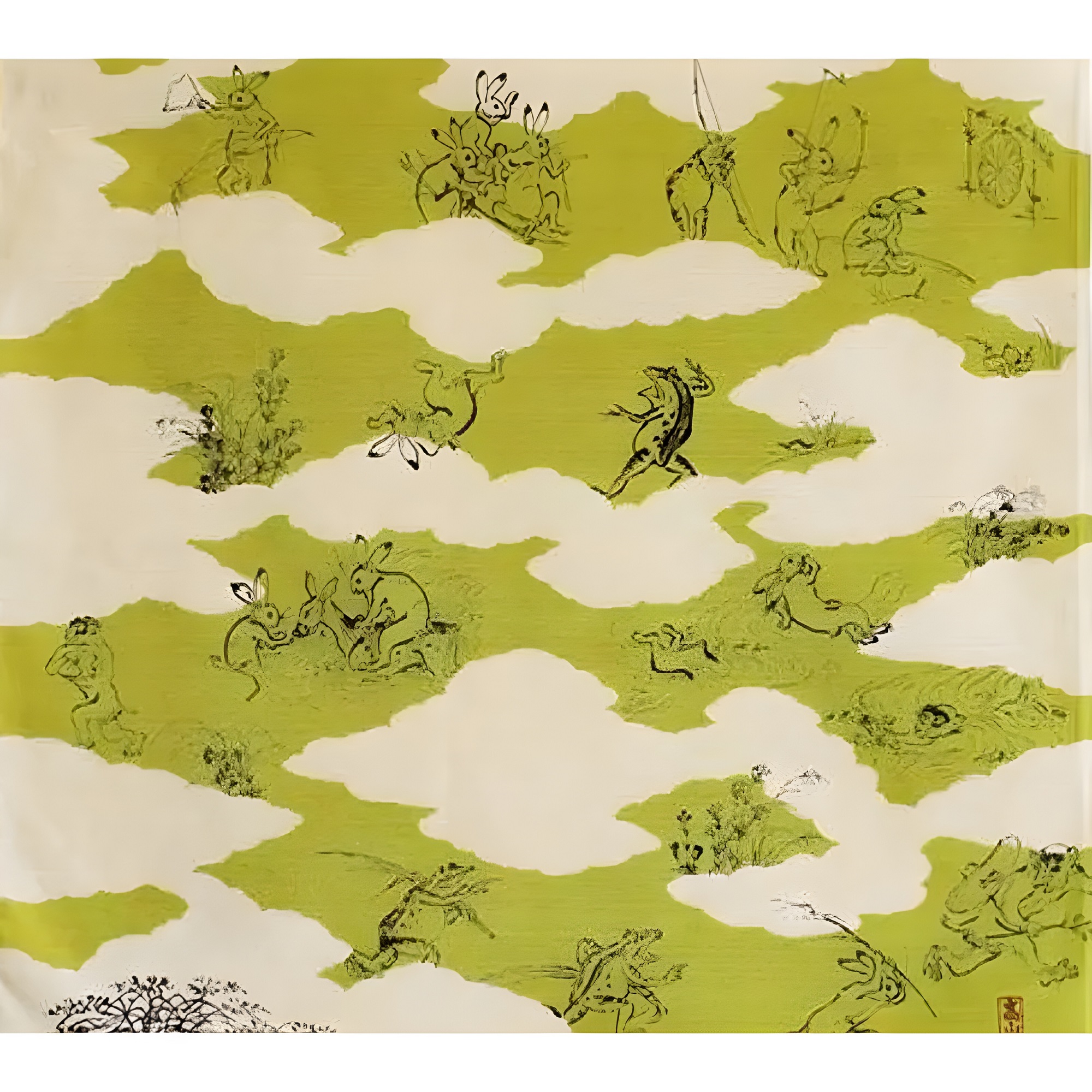 Das Motiv „Chojyugiga“ zeigt Szenen aus den berühmten japanischen Tierkarikaturen, die als Vorläufer des Manga gelten. Diese heiteren Darstellungen von Tieren im menschlichen Alltag verleihen dem Tuch einen besonderen künstlerischen und kulturellen Wert.