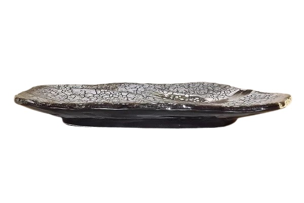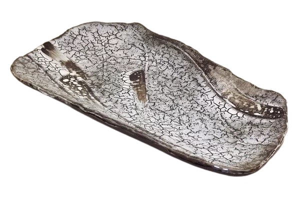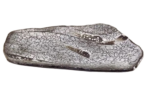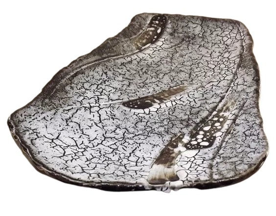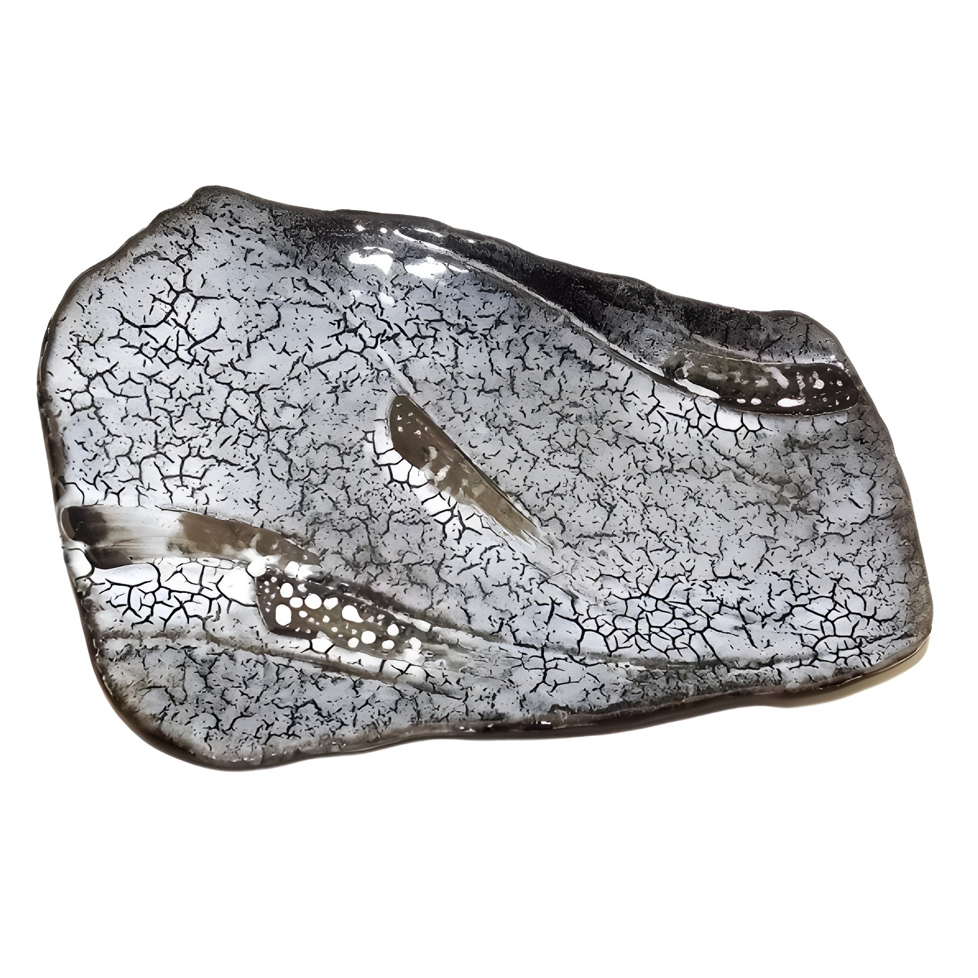 Die Form ist bewusst unregelmäßig gestaltet: Am Kopfteil etwas breiter, zum Fußende hin schmaler, ergibt sich eine spannende Linienführung, die den Blick immer wieder neu fesselt. Von jedem Winkel aus zeigt der Teller ein anderes Gesicht – mal wirkt er klar und ruhig, mal lebendig und voller Bewegung.