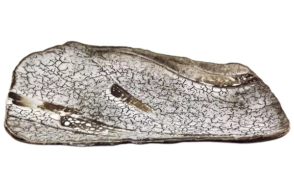 Mit seiner Kombination aus organischer Form, steinähnlicher Anmutung und künstlerischer Glasur verbindet der Teller Ästhetik und Funktionalität und trägt den Geist des Wabi-Sabi – die Schönheit des Unvollkommenen und Unregelmäßigen – in sich.