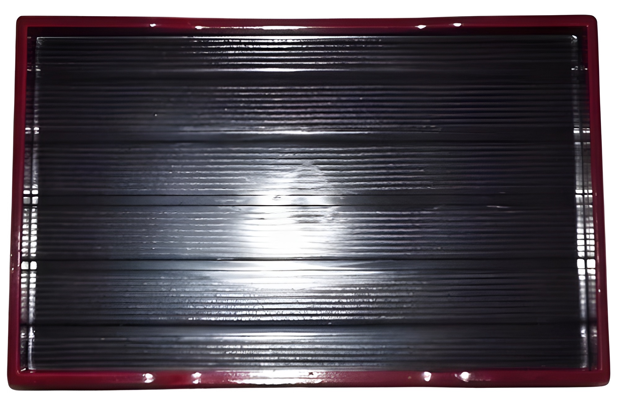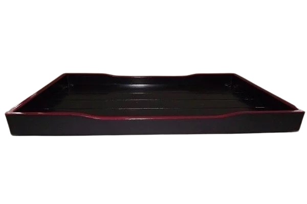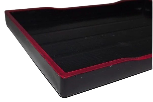 Dieses formschöne Tablett vereint japanische Schlichtheit mit praktischer Funktion. Die matte, leicht glänzende, gerillte Oberfläche in elegantem Schwarz wird durch einen erhöhten, rot lackierten Rand akzentuiert, der nicht nur optisch auffällt, sondern auch für sicheren Halt von Geschirr sorgt.