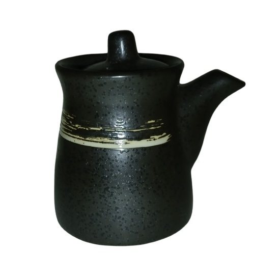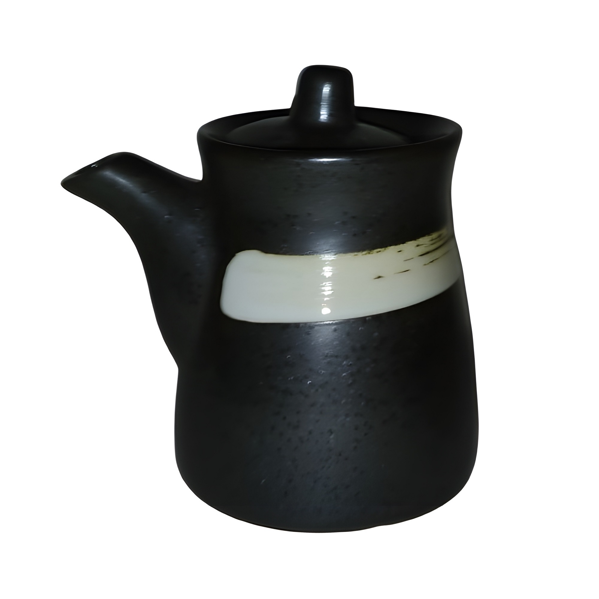 Das Gefäß trägt als zentrales Dekor einen dynamischen weißen Pinselstrich, der das gesamte Kännchen einmal umläuft und an einen kraftvollen Federstrich erinnert. Der Kontrast zwischen der tiefen, schwarzen Glasur und der lebendigen weißen Linie verleiht dem Stück eine klare, moderne Ästhetik, wie sie häufig im japanischen Handwerk zu finden ist.