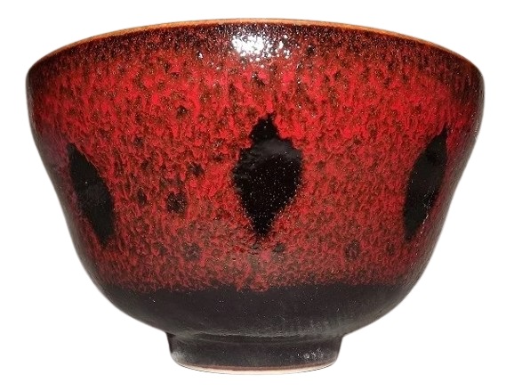 Gefertigt aus hochwertiger Keramik, beeindruckt sie mit einer tiefroten Glasur, die von schwarzen rautenförmigen Mustern an der Außenseite kunstvoll ergänzt wird.